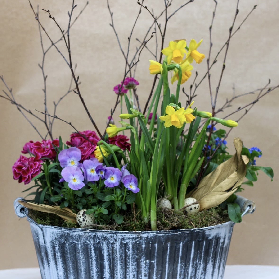 Bunte Bepflanzung aus Frühblühern. Mit Zweigen dekoriert