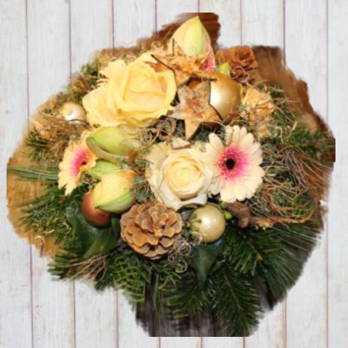Strauß mit weißer Amaryllis, weißen Rosen und und passendem Beiwerk weihnachtlich gebunden, ähnlich wie dargestellt